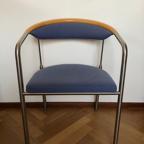 4 stk armstole, model 'Chairman' med stel af børstet stål, kopstykke af mahogni, sæde og ryg betrukket med pastel lyseblå møbelstof.