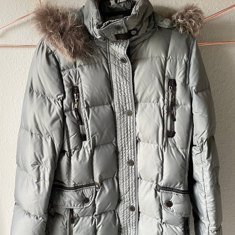 Råhvid damejakke/-frakke størrelse 38. Jakken har knaplukning foran, sidelommer med lynlås.