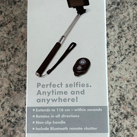 Apple Selfie Stick med grøn håndtag. Fremstillet til at holde smartphones sikkert under fotografering. Justerbar holder til forskellige telefonstørrelser. Materiale inkluderer metal og plastik.