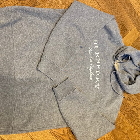 Burberry Andet herre hoodie i størrelse L. Farven er sort, og materialet fremstår som blødt og behageligt. Hættetrøjen har en lynlås foran og er udstyret med Burberrys klassiske ternede mønster på indersiden af hætten. Produktet er velegnet til udendørs brug og dagligdag.
