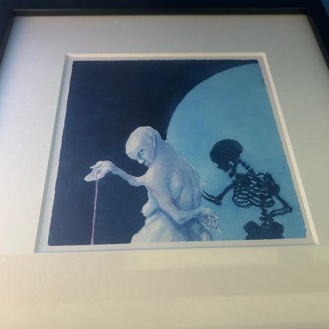 motiv: Klassisk mikael kvirum kunst af en mand/menneske med markant ansigst udtryk, måske selvportræt, 42x42 cm. I sort ramme lige til at hænge op og forundre....