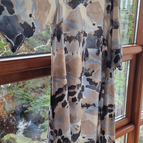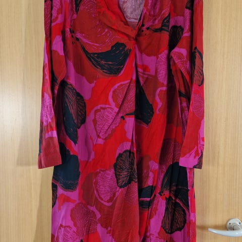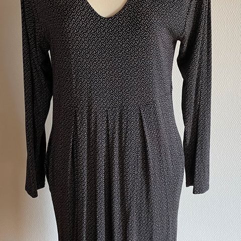 Hvid/sort/orange kjole. A-facon syet i baner. Målebånd på billeder viser mål ÆG til ÆG og længde. I meget fin stand! Sælger ikke noget i dårlig stand eller med fejl! Kan sendes. Kan piftes op til fest, og være alm til hverdag afhængig af tilbehør.