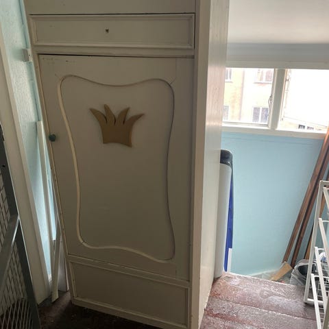 Fint mindre karlekammerskab malet i isblå. Der er bøjlestang og en justerbar hylde. Skabet kan låses. Perfekt som garderobeskab på børneværelset eller i soveværelset.