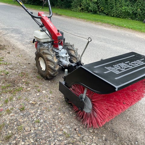 fejemaskine med svingbar kost. Bredde 100 cm. Passer til Nibbi 2 hjulet traktor, kan tilpasses og bruges til en anden traktor. Prisforslag 2500 Kr.