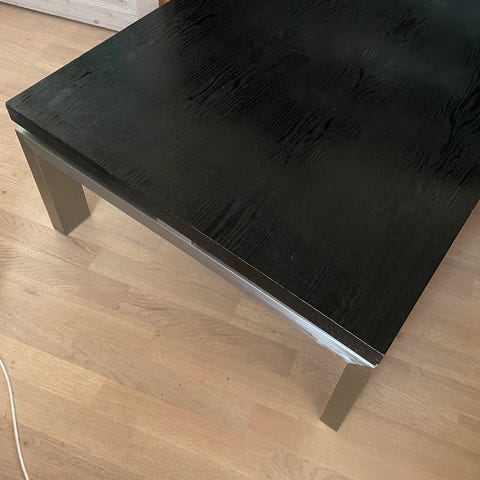 Kvadratisk bord med træbordplade og chrom metalben. Bordpladen har en træfinish, og benene er lavet af metal med en kromlignende overflade. Bordet har en firkantet form og er velegnet til forskellige indendørs formål.