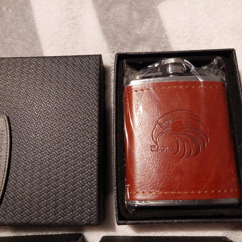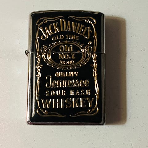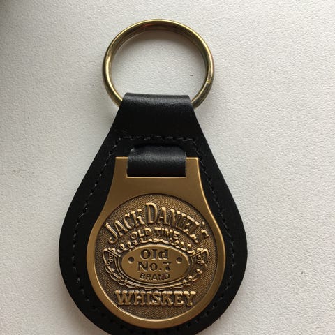 Jack Daniel's nøglering lavet af sort læder med en metalplade foran med indgraveret Jack Daniel's Old No. 7 Whiskey logo. Nøgleringen har en rund metalring til fastgørelse af nøgler. Bagsiden er enkel med syninger langs kanten.