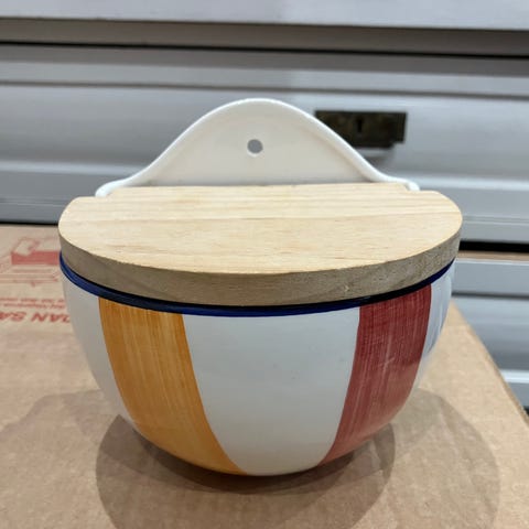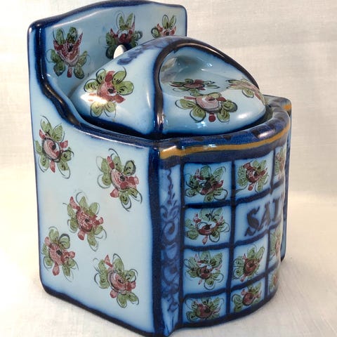 Vintage saltkrukke / saltkar med låg i keramik, til vægophæng, fra VESTAL, Alcobaça, Portugal. Håndmalet med blomster og teksten "SALT" foran. Flot stand - som ny. ,Afhentes i:,Røde Kors Bellinge (461),Bemærk at mail, chat og beskeder ikke besvares, og varen skal købes på knappen "Gå til varen"