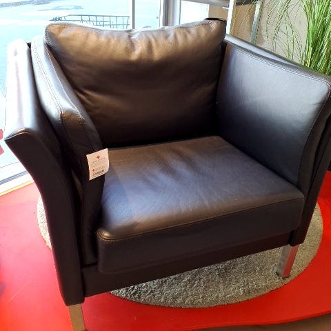 Stolen har en moderne form med bløde kurver og flere polstrede rygkrammer i læder. Sokkel i satinforkrom børste stål Centro lænestol ,Afhentes i:,Røde Kors Roskilde (265),Bemærk at mail, chat og beskeder ikke besvares, og varen skal købes på knappen "Gå til varen"