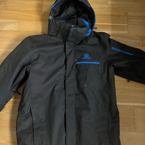 Skijakke, Salomon, str. S-M herre, flot lime grøn farve, i strech materiale, er som ny da den kun er brugt på skiferie. Brystmål 110 cm, længde 65 cm foran og 70 cm bagpå, skulder 50 cm . Med hætte vindfang i ærmer og kanten fornede. Det er ikke en skaljakke, men rigtig Skijakke med foer