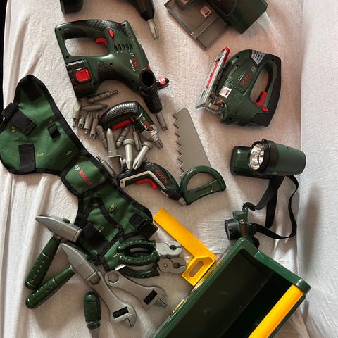 Stor samling af værktøj samt arbejdsbord, bælte, handsker, hjelm og sikkerhedsbriller.