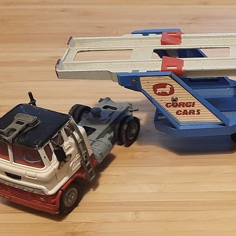 Dette er en Corgi Toys 64 Working Conveyor Forward Control Jeep F.C.-150 legetøjsmodel.