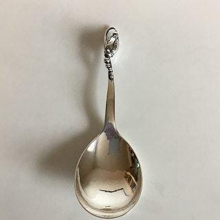 Georg Jensen Magnolia No 84 Sterling Sølv Sukkertang No. 174. Måler 10,5 cm. Designet af Georg Jensen (1866-1935) Georg Jensen var en verdens berømt sølvsmed, der skabte sølvprodukter af kunstnerisk og håndværksmæssig højeste kvalitet. Hans virksomhed har igennem tiden haft over 90 designere. Jensen var meget kunstnerisk som barn og da han var 14, flyttede familien til København, så han kunne komme i lære hos en guldsmed. Hans ønske var dog at blive billedhugger, så han blev optaget som skulpturstuderende på Det Kongelige Kunstakademi i København, hvorfra han dimitterede i 1892 som 25-årig. I tiden efter, mødte han Johan Rohde, maler, designer, billedhugger, forfatter og arkitekt, der sammen med Joakim Skovgaard havde grundlagt Den Frie Udstilling, hvor Jensen blev tilbudt at udstille sin skulptur, som var blevet afvist på Charlottenborgudstillingen. Jensen fik et rejselegat af Det Danske Akademi. Han blev han inspireret af jugendstilen, hvor skønhed og nytte smeltede sammen. An besluttede selv at forene det smukke og praktiske. Jensen tog et job hos Mogens Ballin, dansk Art Nouveau kunstner. Ballin tillod kunstnerne, der arbejdede for ham, at udstille deres værker under egne navne og han gav Jensen kommission. 1904 besluttede Jensen sig for at åbne egen sølvforretning. Han beskæftigede sig med smykker, da det krævede en lille investering. Samme år udstillede han for første gang som selvstændig sølvsmed på Kunstindustrimuseet i København, hvilket var en succes, der kunne mærkes på værkstedet, hvor salget voksede støt. Hans succes med smykker, fik ham til at lave korpus. Han lavede en tekande med det velkendte blomstermotiv ”Magnolia”, hvilket blev prototypen for et hel te/kaffestel. 1916 blev selskabet GEORG JENSEN SØLVSMEDIE A/S stiftet Han vandt Grand Prix på verdensudstillingen i 1927, 1929, 1932 og 1935. Georg Jensen havde fem børn og afgik ved døden i 1935 som 69-årig.