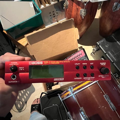 Boss SY-300 Guitar Synthesizer med flere kontrolknapper og en skærm til justering af lydparametre. Enheden har flere indgange og udgange, herunder MIDI og USB, samt en tunerfunktion. Den leveres med en strømadapter.