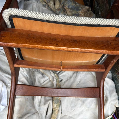 Stolen er gammel og er betrukket med stof. Sidder godt i den. Vil have godt af lidt slibning og olie. Kan afhentes både i Holstebro og Århus