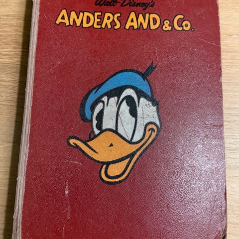 Walt Disney Anders And & Co bog med rød hardcover. Indeholder 8 tegneserier hver med Anders And. Bogen viser tegnede illustrationer og tekst på dansk. Bogens tilstand viser brugsspor, herunder slid på omslaget og siderne.