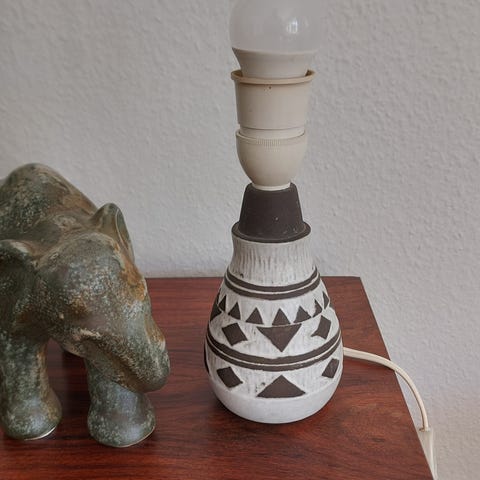 Lampen ligner meget den som er i nedenstående link. Dog er der lidt nuancer i keramikken på den som jeg har. Ingen skår og god stand.
