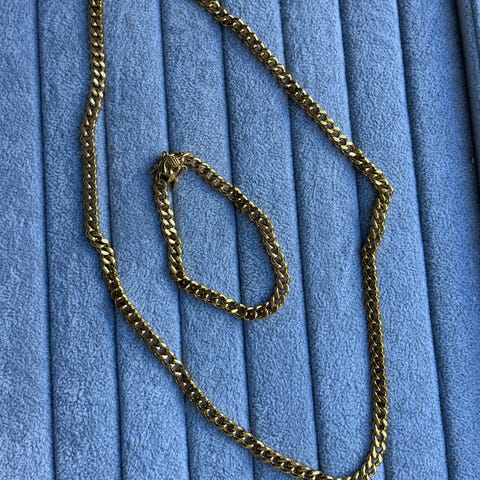 Virkelig flot og stilren panserkæde med matchende armbånd (8mm) udført i 14kt Gold Filled – ikke massiv guld, men med en guldbelægning svarende til 5–10% af kædens vægt (til sammenligning er almindelig forgyldning kun ca. 0,1%).