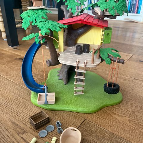 Dette er et legetøjs træhus, der viser en kunstig træstruktur med en lille hytte. Træhuset er udstyret med en rød tag og har grønne plastikgrene og blade, der efterligner naturen. Det har en fastgjort blå rutsjebane, der starter fra et forhøjet niveau ned til basen. Der er også en platform med en gynge der hænger fra en gren. Plastikken der er brugt har skarpe og klare farver. En pose med små plastdele er inkluderet, måske til samling eller leg. Objektets størrelse er 30 cm.