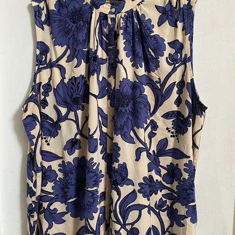 155. Gul Masai bluse med et blomstret mønster i blå og hvide nuancer. Blusen har en rynket halsudskæring med bindebånd og korte ærmer. Den har et let og luftigt udseende, perfekt til sommeren. Er i 100% viskose