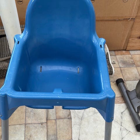 IKEA højstol til børn med blå sæde og hvidt aftageligt bord. Stolen har en stabil konstruktion og er designet til at give sikkerhed og komfort under måltider. Materialerne er plast og metal, og stolen kan nemt rengøres. Velegnet til børn i små størrelser.