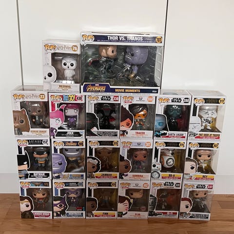 Funko Pop! samling bestående af forskellige figurer fra forskellige serier og film. Inkluderer karakterer som The Joker, Mickey Mouse, Young Elsa, Maleficent, Bulbasaur, Belle & The Beast, og flere. Figurerne er i original emballage med varierende størrelser og farver. Velegnet til samlere og fans af popkultur.