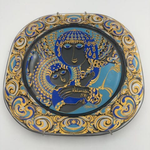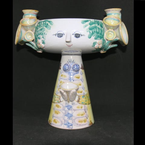 Kæmpe Bjørn Wiinblad blomster opsats i 2 dele, med 6 lysholdere. Den er i perfekt stand på nær et lille afslag på den inderste kant af over skålen og en let krakkelering i en enkelt lysholder. Den er signeret Bjørn Wiinblad og 1979. Den er overdådigt malet i blå farver på grå base og har fantastiske detaljer med blomsterblade der går op om lysholderne på overskålen, der også har gennembrudte blade langs bunden hele vejen rundt. Underdelen har 5 håndtag/hår udsmykning rundt om hovedet, samt flot udformede fingre der holder de 2 nederste lysholdere. En opsats som ikke ses ofte til salg. Den er 49 cm høj og 36 cm i diameter, og vejer 12 kg, så jeg vil helst ikke sende, men kan evt levere, eller mødes med køber. Flere billeder kan fremsendes ved forespørgsel. Bud modtages, men skambud besvares ikke