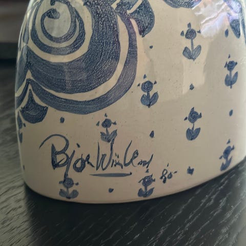 Kæmpe Bjørn Wiinblad blomster opsats i 2 dele, med 6 lysholdere. Den er i perfekt stand på nær et lille afslag på den inderste kant af over skålen og en let krakkelering i en enkelt lysholder. Den er signeret Bjørn Wiinblad og 1979. Den er overdådigt malet i blå farver på grå base og har fantastiske detaljer med blomsterblade der går op om lysholderne på overskålen, der også har gennembrudte blade langs bunden hele vejen rundt. Underdelen har 5 håndtag/hår udsmykning rundt om hovedet, samt flot udformede fingre der holder de 2 nederste lysholdere. En opsats som ikke ses ofte til salg. Den er 49 cm høj og 36 cm i diameter, og vejer 12 kg, så jeg vil helst ikke sende, men kan evt levere, eller mødes med køber. Flere billeder kan fremsendes ved forespørgsel. Buddet modtages, men skambud besvares ikke