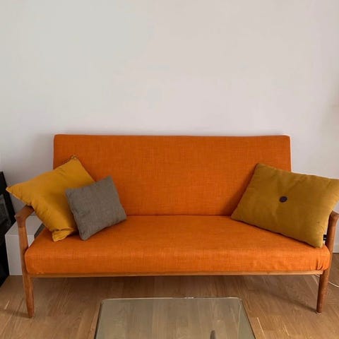 Super smuk og sjælden træ-sofa i ask af Aage Olsen, udført af Fritz Hansen cirka 1945 (se foto fra bog). Vi har udskiftet 5 træpinde på højre side, da de var i stykker da vi købte den. Desuden er der en pind på venstre side som har en sprække. Den er stabil at sidde i og fremstår flot. Sidde højden er 37 cm. Prisen er 3000 eller højest bydende.