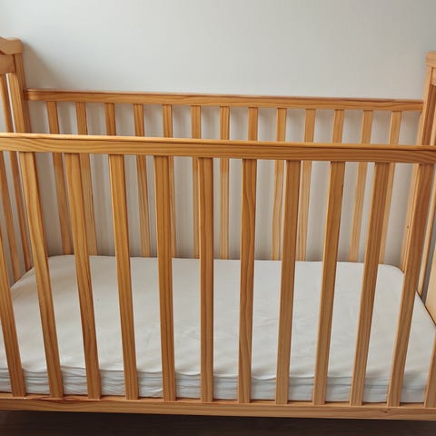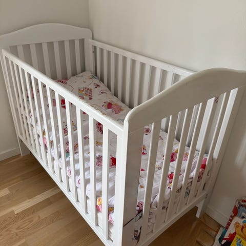 JLY Tremmeseng børneseng i hvid farve. Fremstillet af træmateriale med tremme design, velegnet til børn. Sengen har en robust konstruktion og et enkelt, funktionelt design.