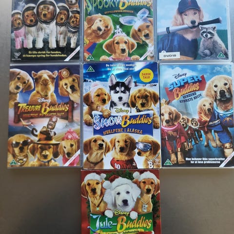 Buddies DVD Sæt indeholder 6 film med hunde, herunder Air Buddies, Snow Buddies, Space Buddies, jule-buddies og Spooky Buddies samt Jule Hunden. Filmene er familievenlige og fokuserer på hundenes eventyr og venskab.