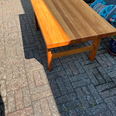 Smukt og solidt sofabord i massivt egetræ, klassisk dansk snedkerkvalitet. Bordet er stabilt, velholdt og uden løse samlinger. Passer perfekt til både sommerhus, stue eller rustik indretning.