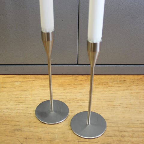 Piet Heins Venus lysestager i rustfrit stål. Et ikonisk sæt, der skaber stemning med stil. De er brugt og har nogle småridser på fødderne (se billede). Desuden lidt mørkere indvendigt i toppen pga lys. Men i super fin stand.