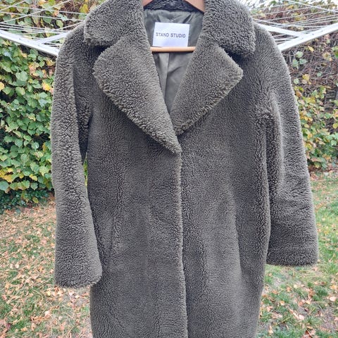 Beige plydspels til kvinder i størrelse L. Jakken har en blød og varm tekstur, egnet til udendørs brug i koldere vejrforhold.