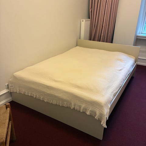 Hjemmebygget høj seng og boxmadras på 140x200 gives væk. Sengen skal hentes på Nørrebro på 1.sal og du skal selv kunne tage den ned.