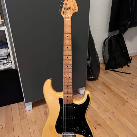 Fender Stratocaster fra 1973 i en flot Fiesta Red finish. Ventura Guitars. Denne helt fantastiske og velholdte Strat ser original ud undtagen pickupper og elektronikken som er udskiftet med elektronik fra Fender Custom shop og et sæt håndviklet Seymour Duncan Antiquity ll surf 60'. Alt andet tror vi er som den blev bygget i 1973 og har en meget clean medium shape neck med rosewood fingerboard, en lav action og båndene har det rigtigt fint også. Der er skøn liv i kroppen og tonen vibrere når du tager en åben A som giver os en dejlig følelse liv. Vægten er 3,5 kg som er i den lettere klasse for årgangen. Guitaren har tilhørt en kendt dansk musiker og kan sikkert høres på mange indspilninger igennem årene.