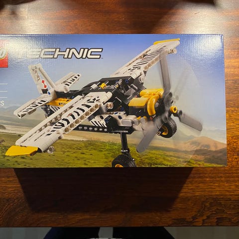 LEGO Technic Flyvemaskine byggesæt i farverne hvid, sort og turkis. Sættet indeholder en model af en propelflyvemaskine med bevægelige dele og inkluderer en instruktionsmanual.