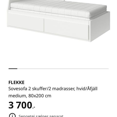 Flekka udtræksseng fra IKEA inkl 2 madrasser og topmadras. 1 madras fra IKEA andre madrasser er i luksus kvalitet fra andet mærke. Alt købt fra nyt indenfor sidste år.