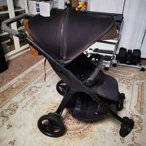 Lækker klapvogn m justerbart håndtag, drejhjul og soltag, den kan ligges helt ned så barnet kan ligge udstrakt , der er slid på håndtaget se billede og den vil have glæde af en vask.