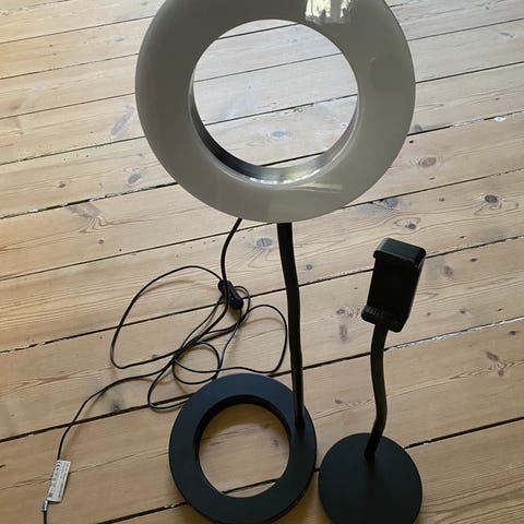 Jeg sælger min ring light lampe, som kan stå på bordet. Den har indbygget mobilholder og giver et flot, jævnt lys – perfekt til makeup, videoer, billeder eller online møder.