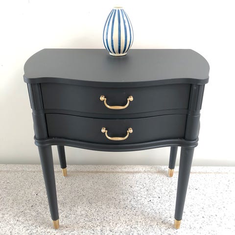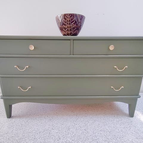 Flot retro kommode fra 40/50’erne. Den er ny malet med miljøvenlig maling fra Fusion i en flot koksgrå/Ash farve. Farven kan snyde en anelse på foto. Skuffefronterne er olieret nøddetræ. Skufferne er pæne indeni og de kører godt. De gamle greb er i poleret messing.