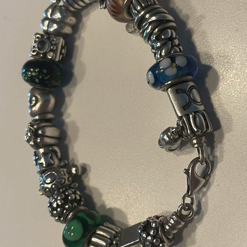 Pandora-armbånd med mange forskellige charms, der kan tilføjes for at skabe et personligt smykke. Pandora-smykker er håndlavede og fremstillet af ægte materialer, primært sterlingsølv, guld, perle og sten
