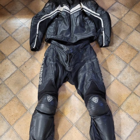 Arlen Ness motorcykeljakke og bukser i sort læder med hvide og grå detaljer. Jakken er størrelse 54 og bukserne 52. Det er brugt endel men giver stadig den beskyttelse du har brug for. Det kan lynes sammen til en dragt. Prisen er selvfølgelig for både bukserne og jakken. Kan godt sendes men det bliver nok lettest med afhentning da det fylder ret meget og er ret tungt.