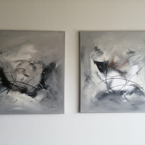 Har 3 stk i samme serie af maleren Jannic. De måler 70 cm+70 cm. Der er desværre kommet et par små buler i det ene. Derfor er prisen kun 1000 kr. De skal afhentes i Vallensbæk strand. Har flere malerier til salg så tag gerne et kig.