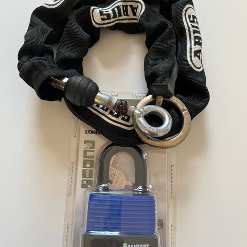 ABUS kædelås med nøgle, sort farve, robust kæde med stofbeklædning for at beskytte mod ridser. Designet til sikker fastlåsning af cykler eller andre genstande. Købt i 2021. Der medfølger 1 nøgle. Kvittering Haves