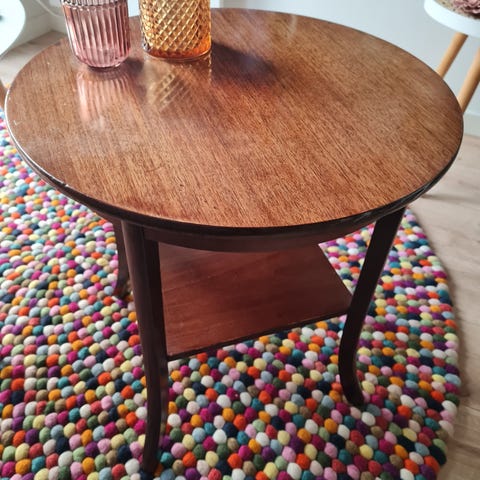Lille gammelt hvidmalet bord med en del patina. Der ligger en glas plade på.