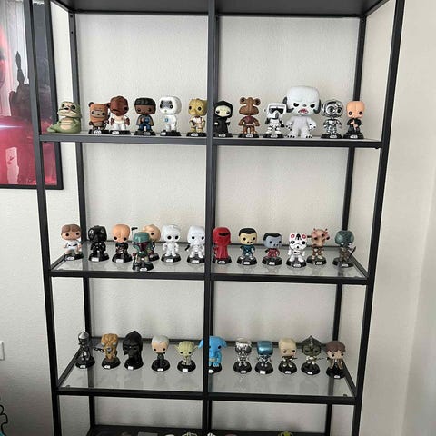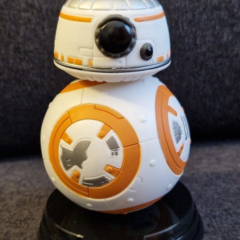 Star Wars BB-8 figurine i hvid og orange med sort stand. Figuren er rund og detaljeret, designet som robotten BB-8 fra Star Wars-serien. Velegnet til samling eller dekoration.