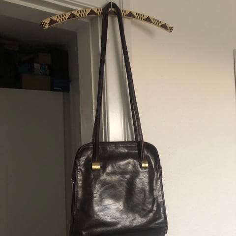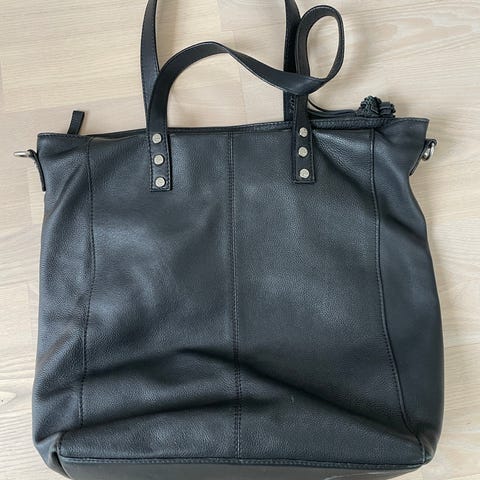 Læder/ ruskind. Taske i sort farve med krokodillepræget mønster. Tasken har to skulderstropper, en lynlåslomme på ydersiden og flere rum indvendigt, hvoraf der er to med lynlås