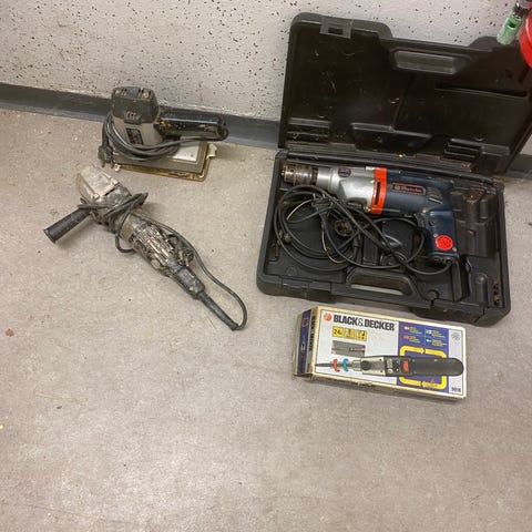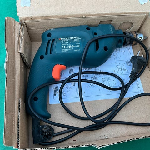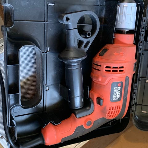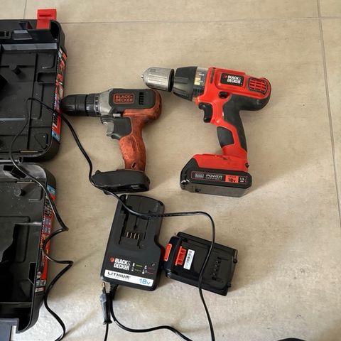 Black & Decker værktøjssæt indeholdende en boremaskine og diverse tilbehør i en sort opbevaringskasse. Sættet er egnet til forskellige gør-det-selv opgaver og opbevares praktisk i den medfølgende kasse.