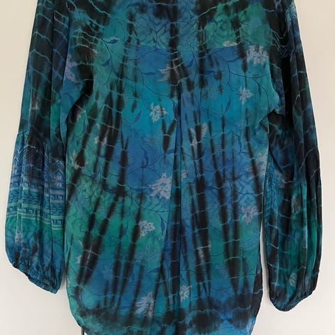 Bluse i 100%silke med elatisk foer, hel lengde 66. Overvidde foer 112 erme 48. Brukt meget lidt, uten skader. Den er florlett og deilig. 450kr