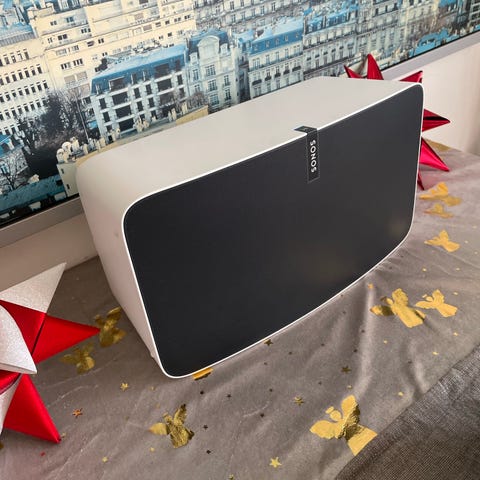 Sonos Play:5 trådløs højttaler i hvid farve. Designet til at levere lyd i høj kvalitet med mulighed for trådløs tilslutning. Passer til brug i hjemmet til musikafspilning via kompatible enheder som iPod, iPhone og iPad.